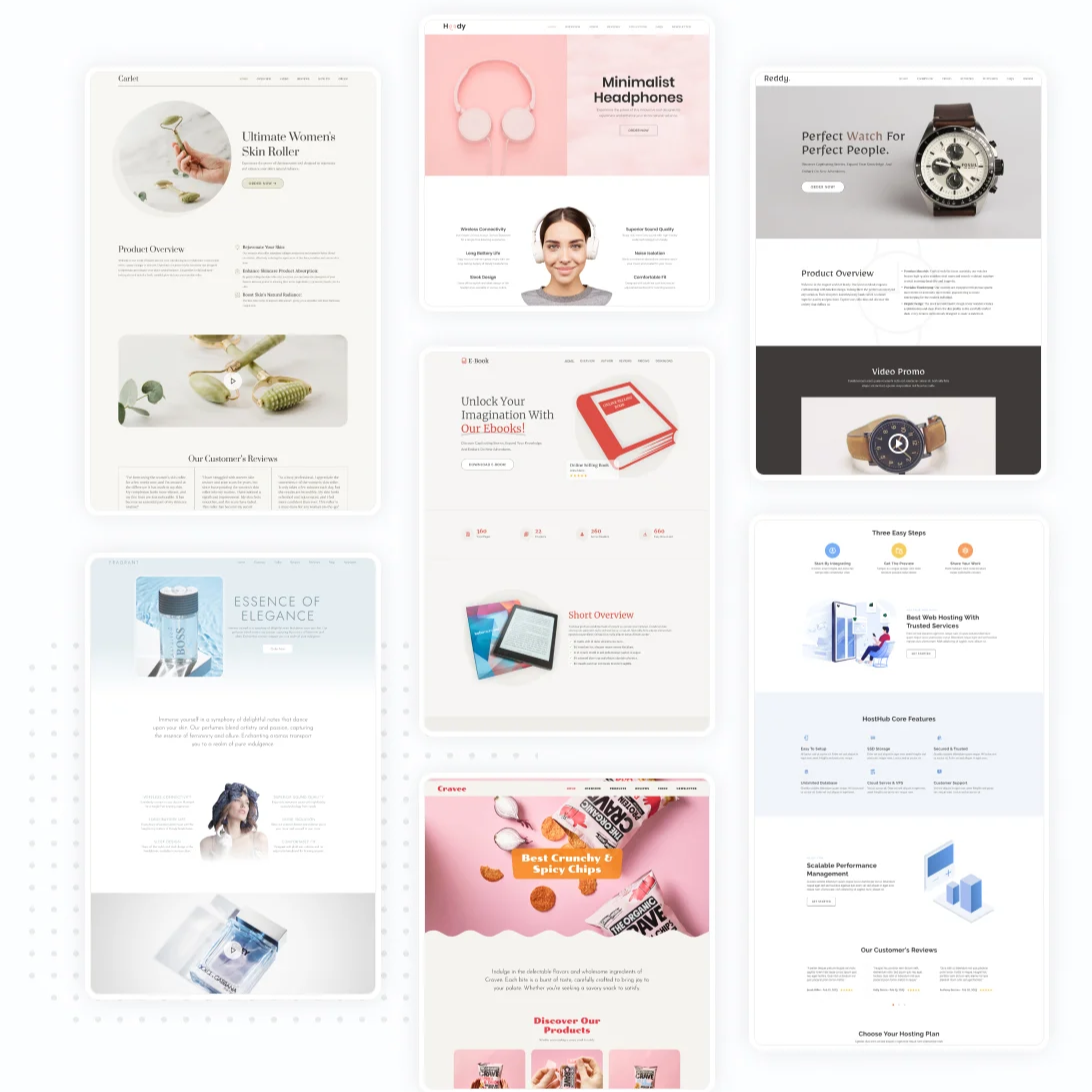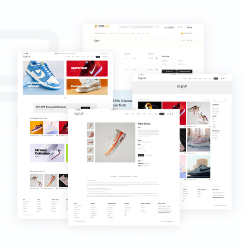 Specific pages for eCommerce websites. Included pages like Shop, Product, Cart, Wishlist, Account, Checkout, Order Tracking, FAQs, etc.